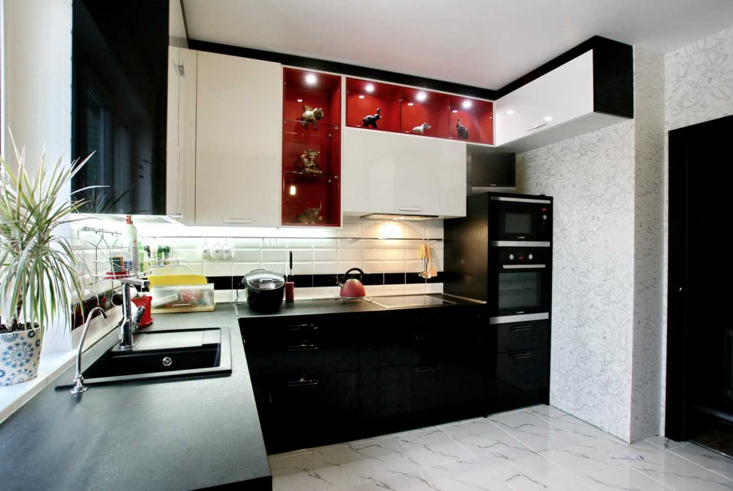 Еще один пример сочетания плитки с контрастной отделкой. Это решение хорошо подходит для небольших кухонь, потому что делает визуально помещение глубже