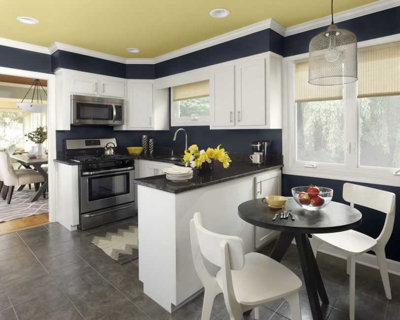 Потолок можно отделывать по-разному, и чтобы конструкция была еще более оригинальной, можно комбинировать разные типы материалов. Покраска вместе с деревянными рейками, плитка с обоями и другие решения сделают из кухни образец дизайнерской оригинальности.