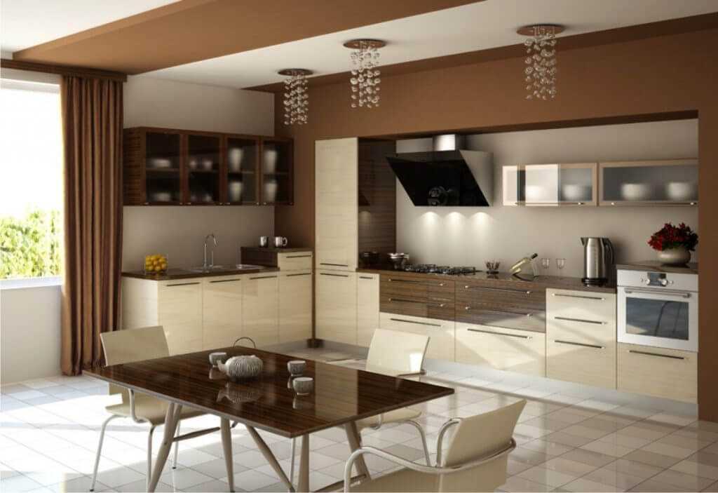 Освещение на кухне подбирается с учётом величины комнаты, его роли и стиля. Одной люстры по центру достаточно в маленьких кухнях, в больших же можно выбрать любой вид освещения, подходящий по высоте и дизайну.