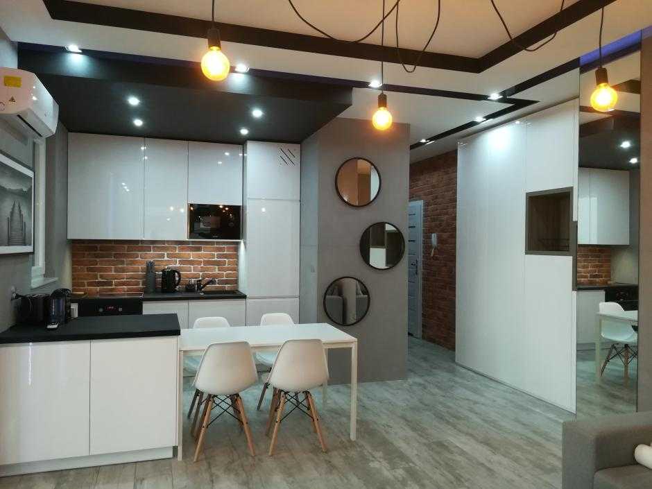 Современный дизайн кухонных натяжных потолков предполагает сочетание с диодными светильниками или люстры на подножке под полотном. По эстетике такой потолок превосходен, особенно в кухне, объединенной с гостиной. Организации, занимающиеся монтажом, предложат любой цвет и полотна с разной степенью светоотражения. В узкой кухне получится 1 бесшовное полотно, что очень экономично.