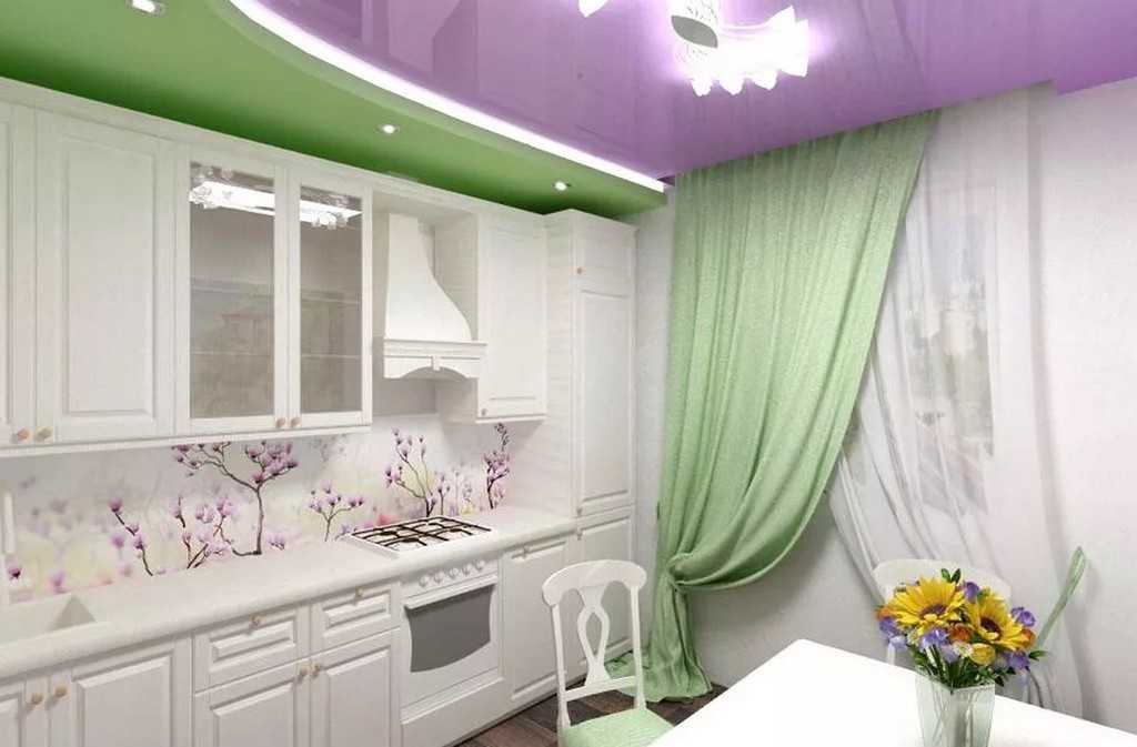 Если высота вашей кухни позволяет разыграться вашему воображению, уместно использовать гипсокартон и создать на его базе сразу несколько уровней натяжной конструкции.