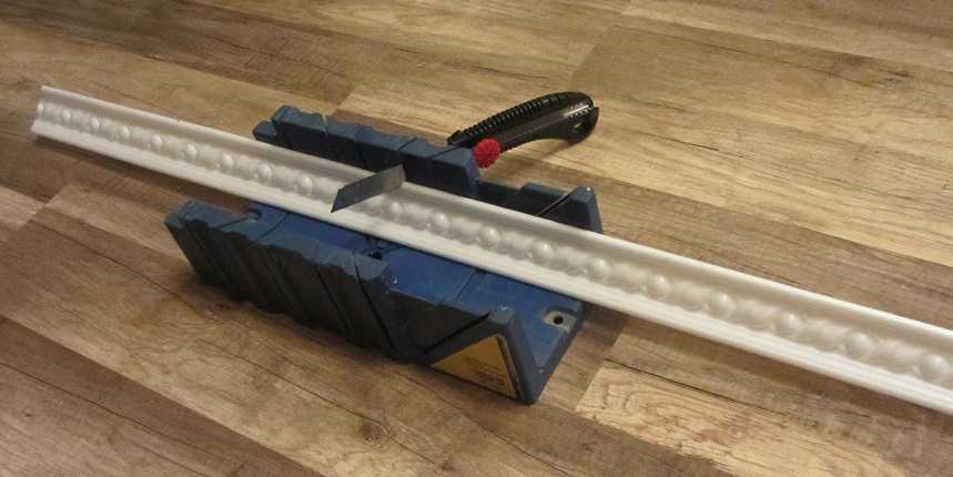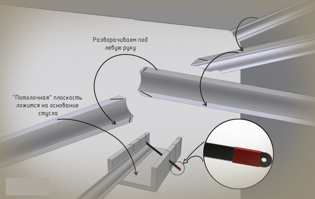 Для этого нам понадобится ножовочное полотно (от ножовки по металлу) или пила с небольшими зубьями, а также стусло (см. Пластиковый потолочный плинтус: первое знакомство).