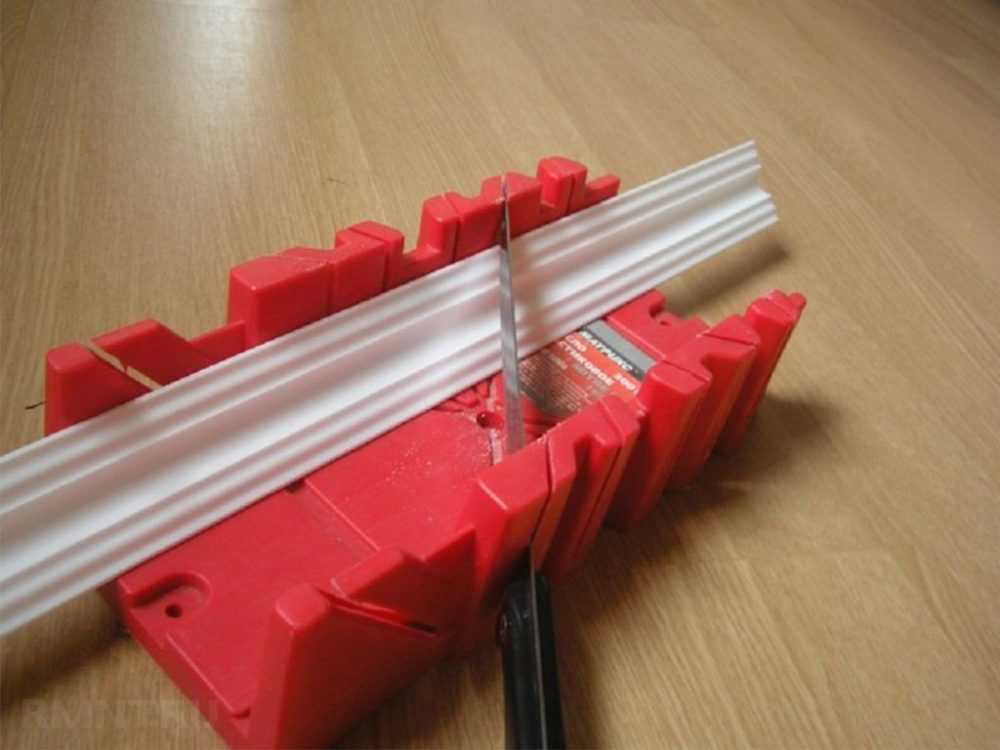 Благодаря способности пластикового плинтуса слегка перемещаться по панели ее поверхность, тем самым, защищена от деформации. Чтобы выполнить установку, потребуется применить планку из дерева, которая фиксируется на потолке или стене при помощи дюбелей, а затем к ней закрепляется профиль из пластика при помощи саморезов. Подрезая углы, обязательно нужно пользоваться стуслом. В зависимости от конструкции существует разновидности плинтусов, отличающиеся внешне. Так, многие образцы оснащены функцией регулирования угла наклона, а также поворотным механизмом, благодаря которому ножовку можно закрепить в любом положении. Если опыта по работе с ножовкой нет, то лучше будет воспользоваться электролобзиком. По окончании распила торцы материала обязательно следует обработать с помощью наждачной бумаги