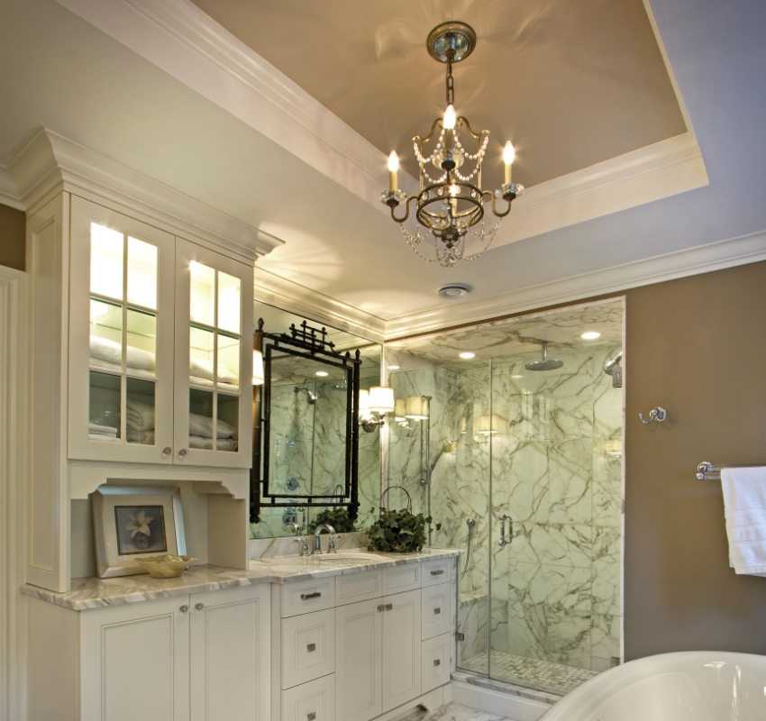 Потолок хорошо смотрится в помещениях большой площади, требующих зонирования. Можно выделить участок с ванной или душевой кабиной, стиральной машиной или раковиной. При монтаже этой конструкции используют 2 цвета, например серебристый и золотой.