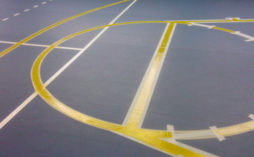 Нанесение игровой разметки спортивной площадки на линолеуме может производиться с помощью двухкомпонентного состава на основе полиуретана.