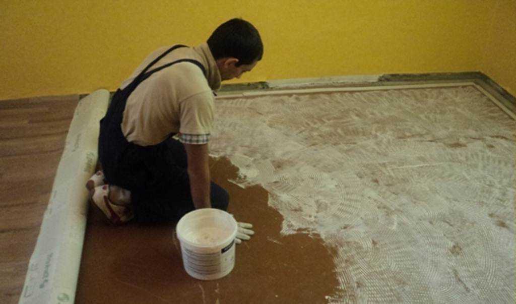 - Приклеивание при помощи клея. При использовании данного метода, выбранный материал прослужит максимального долго. Способ применим к помещениям с общей площадью более 20 кв. м. Но стоит отметить, что данный способ по сравнению с двумя другими является наиболее трудоемким и сложным.