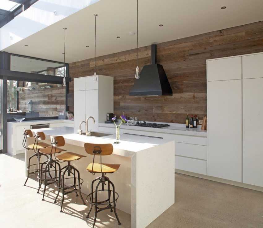 Практически все видели подобные покрытия на полу, а вот с такой необычной отделкой стен встречались немногие. Поэтому, ниже приведено несколько фото примеров того, как может выглядеть отделка кухни ламинатом, если он закреплен на стены.