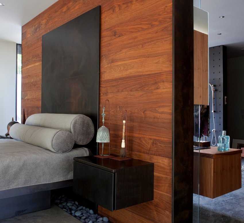 Очень превосходно в этой комнате выглядит ламинат на стене в интерьере. Фото самых интересных вариантов говорят о том, что в спальне принято отделывать поверхность стены, которая расположена за изголовьем большой кровати. Панели подбирают в точном соответствии со цветом мебели. В результате создается впечатление единого гарнитура. На отделанной ламинатом стене можно тоже закрепить различные полочки и аксессуары, которые придают уют и вселяют жизнь в любой интерьер.