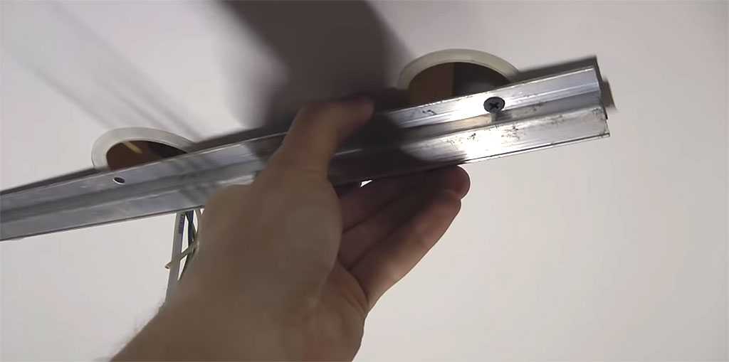 Чтобы планка после установки не шаталась, берут пластиковую трубу (меньшего диаметра, чем кольца). Её вставляют в отверстие, упирая в потолок, отмеряют нужную длину и отрезают. Расстояние до перекрытия в разных точках будет отличаться, поэтому куски лучше подписать. Планку фиксируют через трубки, вставленные в отверстия. Основание будет опираться в перекрытие через трубы, поэтому станет более устойчивым. Затем осветительный прибор прикручивают к планке. Предварительно выполняется подключение к сети.