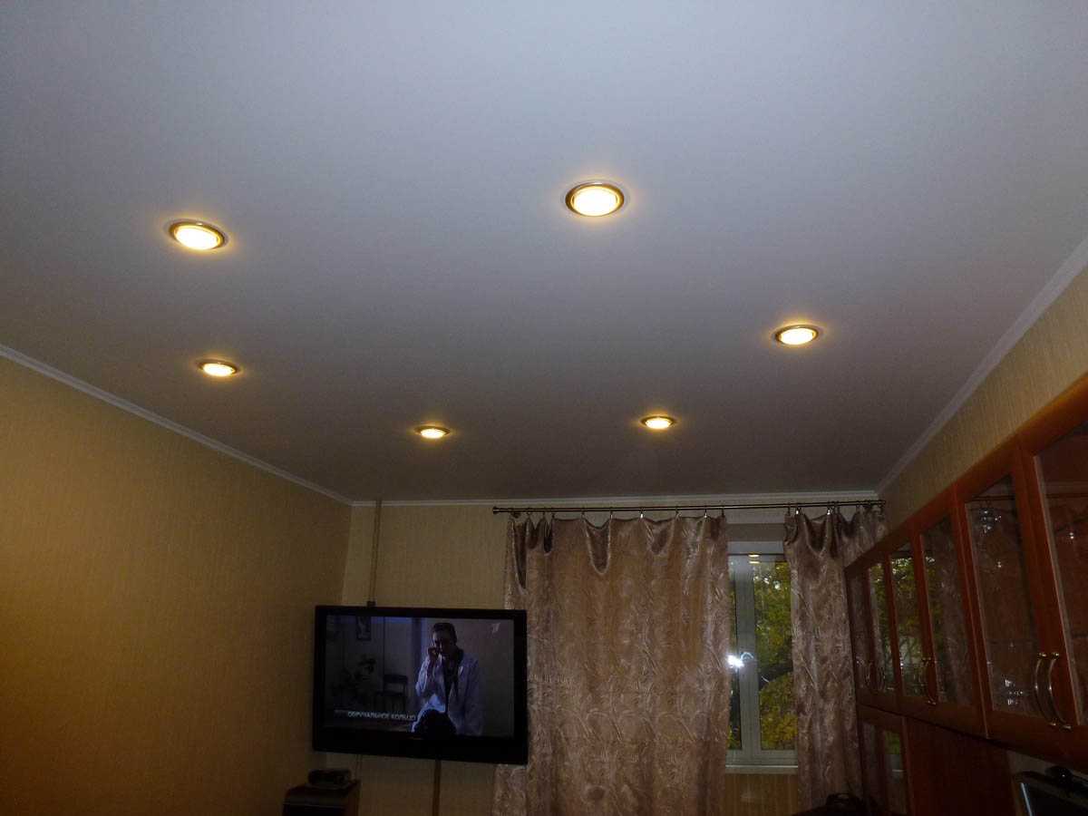 - если вы используете споты в привязке с натяжными потолками из обычной ПВХ-пленки, то предельно допустимая мощность для галогеновых ламп — до 20 Вт, для сатинового полотнища чуть больше — до 35 Вт;