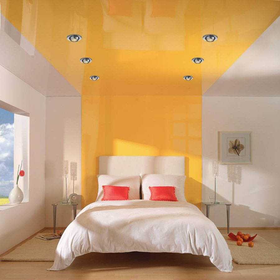 При установке в спальне глянцевого потолка точечная подсветка не используется, потому что блики от них мешают отдыху.