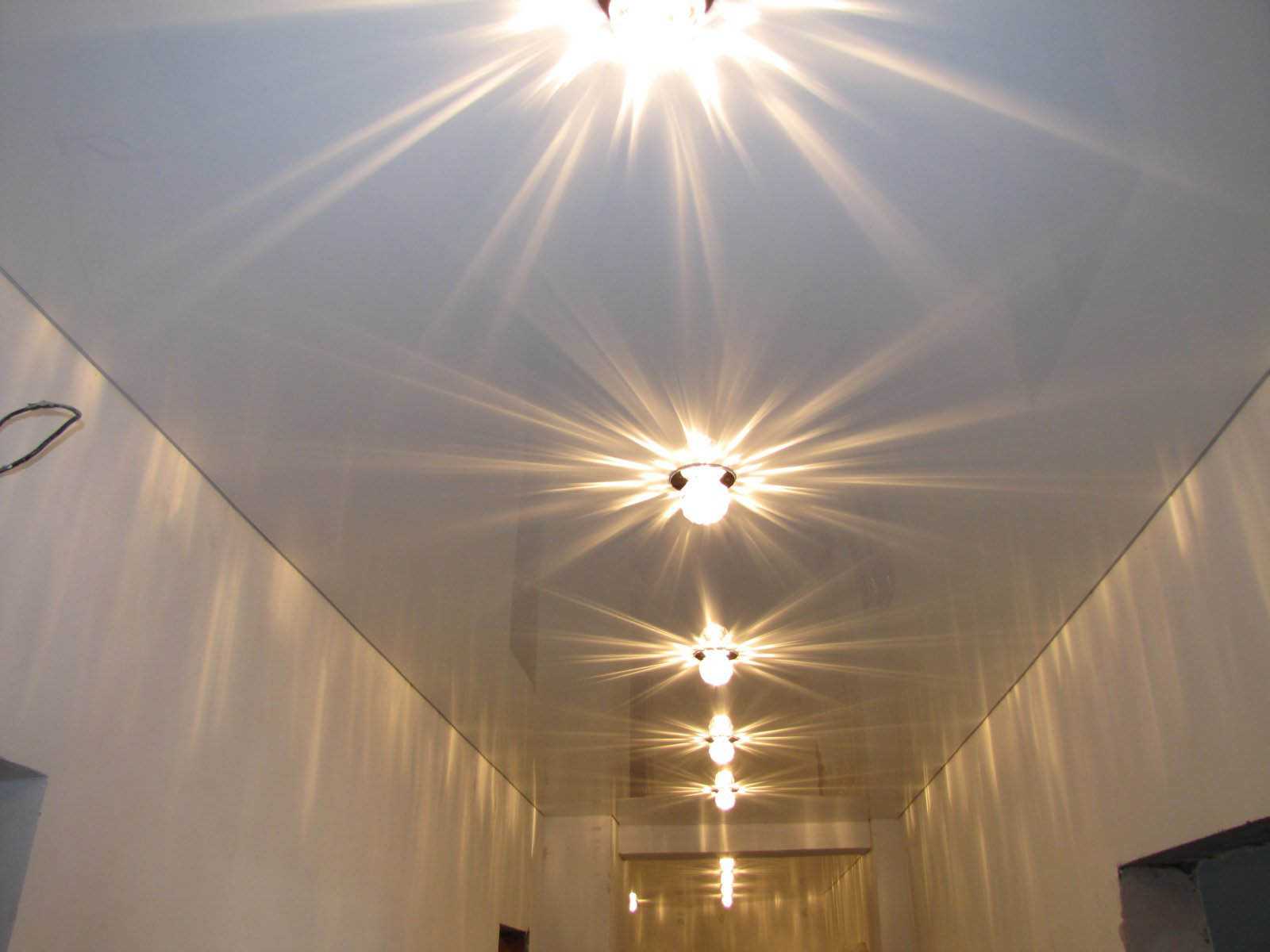 2. Глянец отзеркаливает свечение. Это выглядит эффектно. Мощность светильников до 40 Ватт будет достаточной, чтобы создать комфортную обстановку и хорошую видимость. Помните: слишком яркое освещение быстро утомляет.
