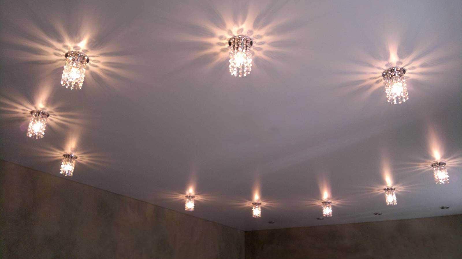 - точное количество светильников всегда определяется типом светового рисунка в помещении, но один спот способен осветить не более 2 м2 свободной площади. Эту цифру нужно держать в уме при составлении плана расположения точечных светильников на натяжном потолке.