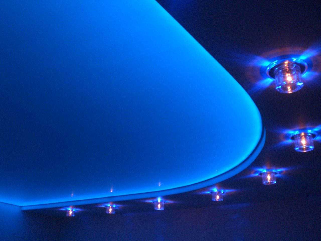 В настоящее время для натяжных потолков используются светодиодные источники света, специальные светящиеся ленты. Такие светильники потребляют относительно небольшое количество электроэнергии. Если вы выбираете для своего потолка установку светодиодной ленты в качестве встроенной яркой подсветки в зале, то помните, что для такого источника света необходим особый блок питания (драйвер), размещающийся в доступном месте. Светодиодные светильники способны прослужить максимально долго. Наиболее удобными и практичными считаются такие лампы низковольтного типа.