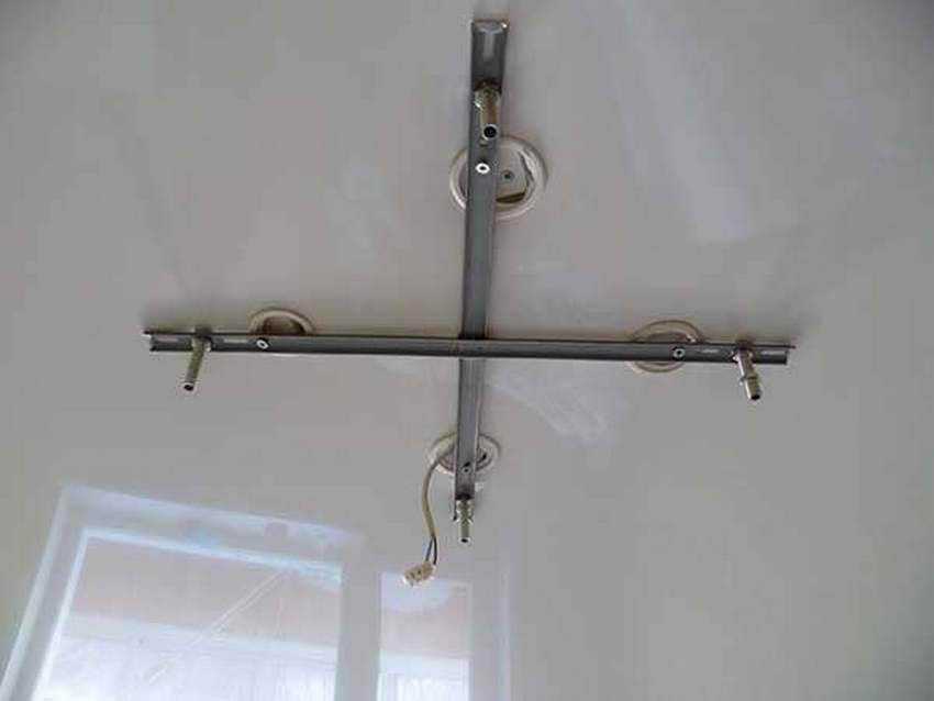 - Если же он отсутствует, но возникла необходимость повесить люстру на натяжной потолок именно таким образом, держите основной порядок действий, который поможет вам быстро справиться с проблемой: