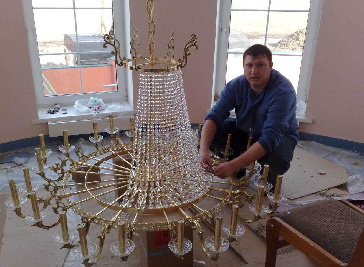 - люстра подключается к питанию и надсаживается на шпильки, после чего останется только надежно зафиксировать ее комплектными гайками.