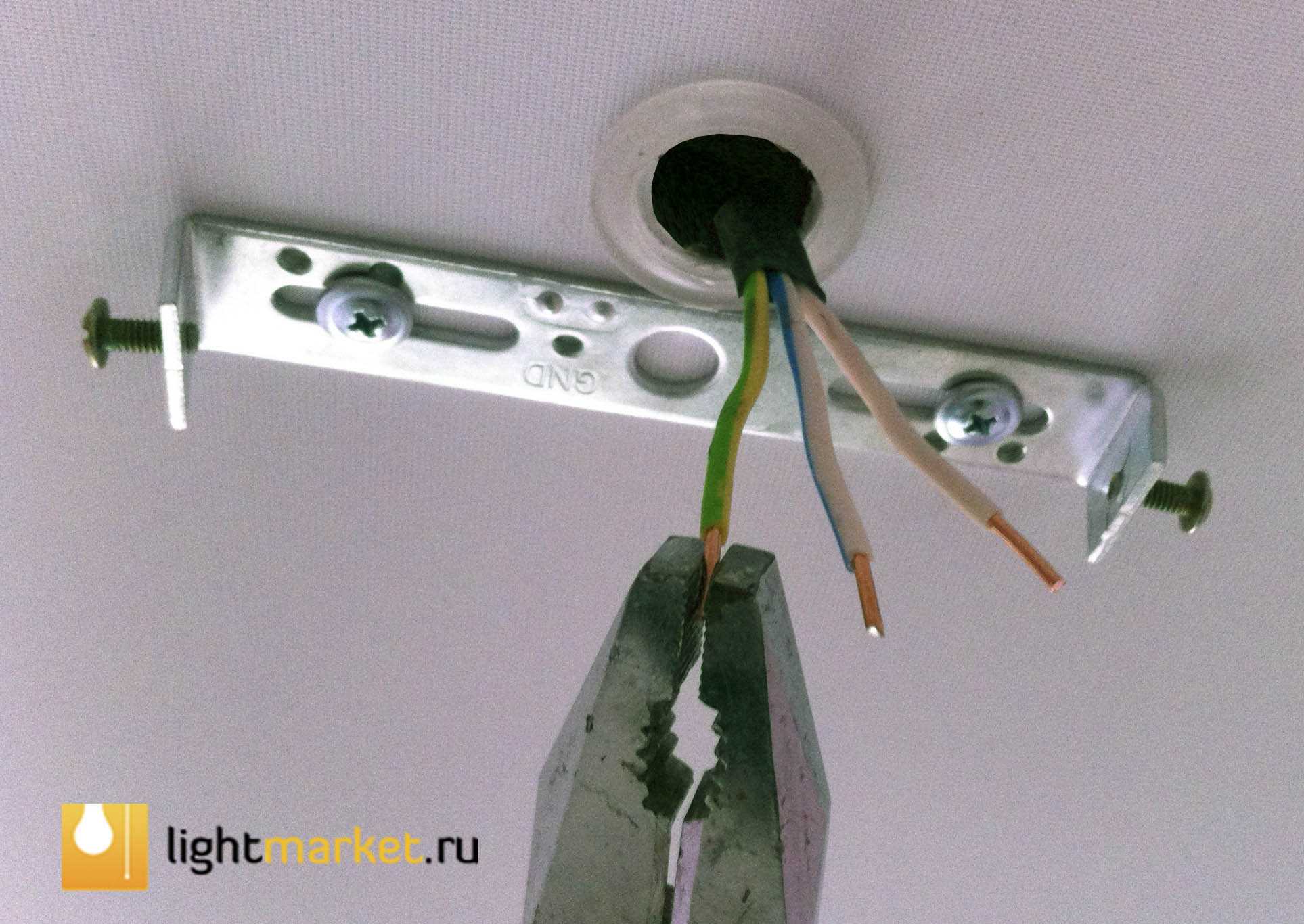 После установки крепления для люстры к этому месту подводят питание. Чтобы кабель не мешал при монтаже натяжного потолка, концы закрепляют на крюке.