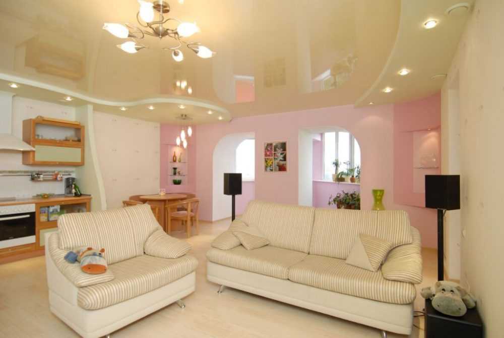 Двухуровневый дизайн удачно встанет исключительно в просторном помещении, в частности зале, где достаточно высоко расположен основной потолок. В миниатюрных помещениях также уместен потолок в несколько ступеней, но лучше устанавливать предельно простые конструкции. При ограниченной площади лаконичность без лишних деталей должна преобладать и в принтах, и в цветовой гамме. В интерьер маленьких комнат не вписываются объемные витиеватые конструкции.