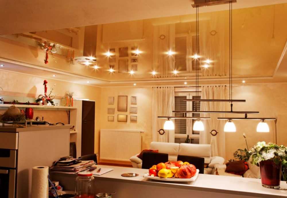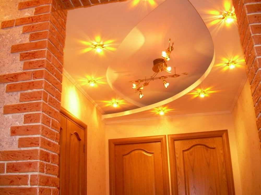 Свет должен быть насыщен яркими тонами, но не до такой степени, чтобы свет резал глаз. Лучший вариант — это создание рассеянного света. Точечные светильники можно расположить многочисленными пучками, а по центру разместить люстру.