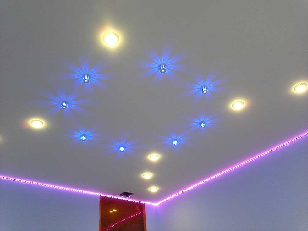 Существует множество вариантов освещения, которые используют при установке натяжных потолков. Среди них — встроенные точечные светильники, диодные мини-лампы, споты, люстры, а также подсветка по краям и изнутри. При выборе системы освещения есть ограничение — полотно не должно перегреваться в процессе использования.