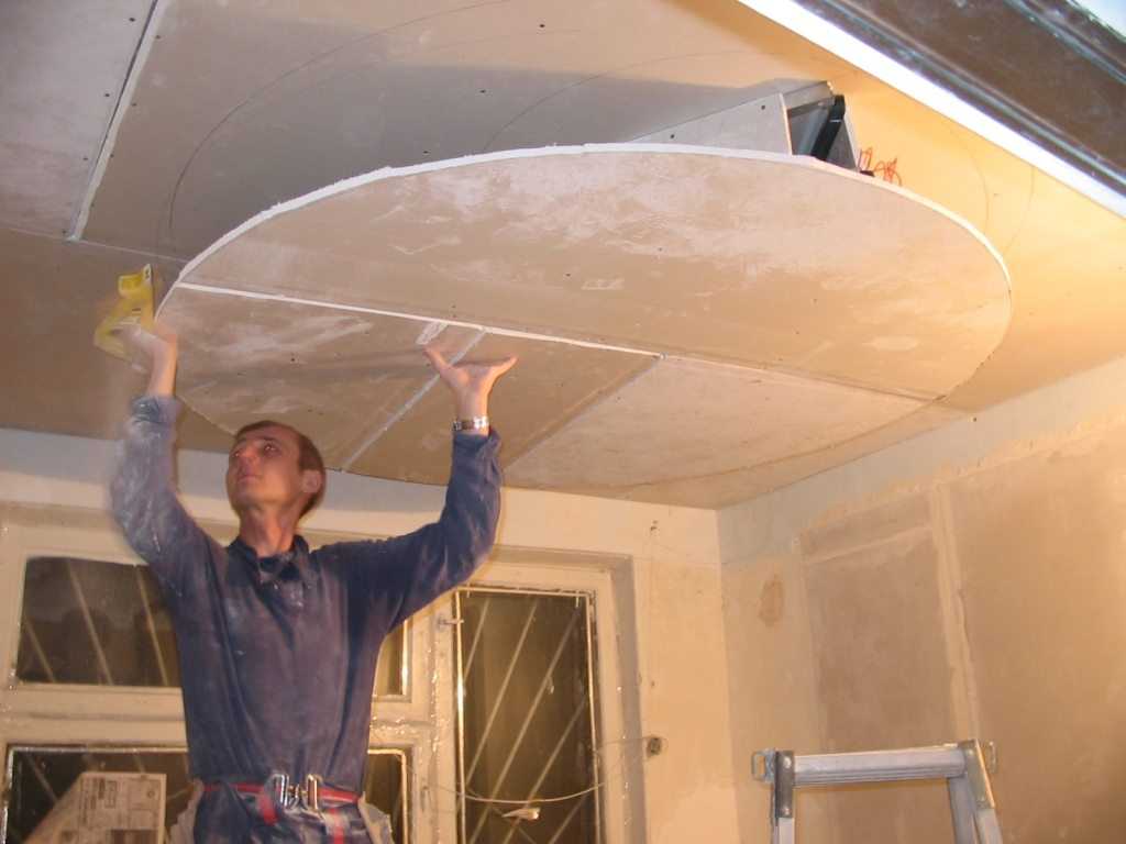 - Делая отступ около 100 мм от потолочного перекрытия, монтируем первый уровень потолка на каркас из металлического оцинкованного профиля.