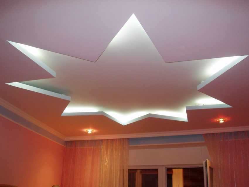 Можно взять за основу геометрические фигуры, симметричные или асимметричные простые рисунки. Изогнутые линии удобно монтировать из гипсокартона, сочетая его с натяжным полотном.