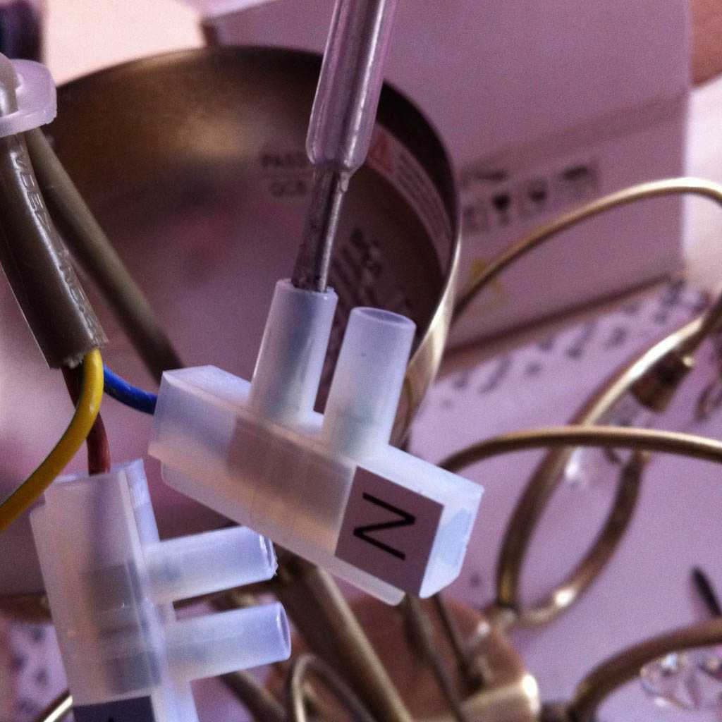 - Достать провода, подвесить на крюк люстру, подключить ее и проверить, поступает ли ток.