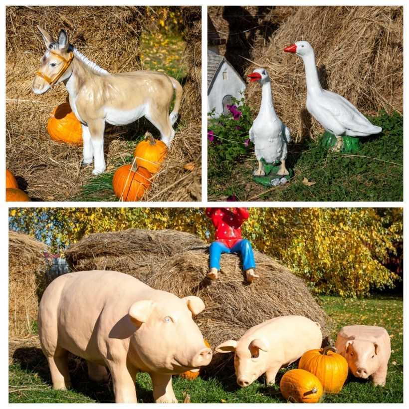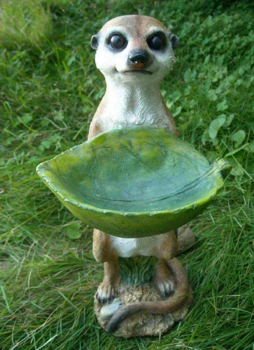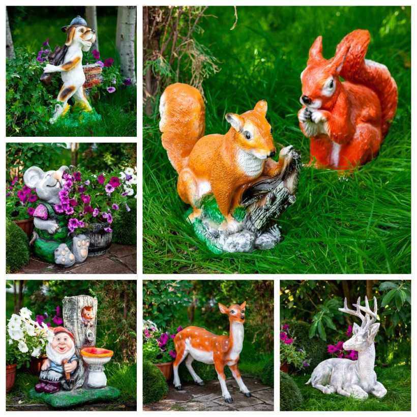 Самыми распространёнными украшениями для сада являются фигурки животных, птиц и насекомых. Например, рядом с клумбой очень мило будут смотреться гипсовые ёжики, а рядышком с пеньком — аисты в гнёздышке из веток.