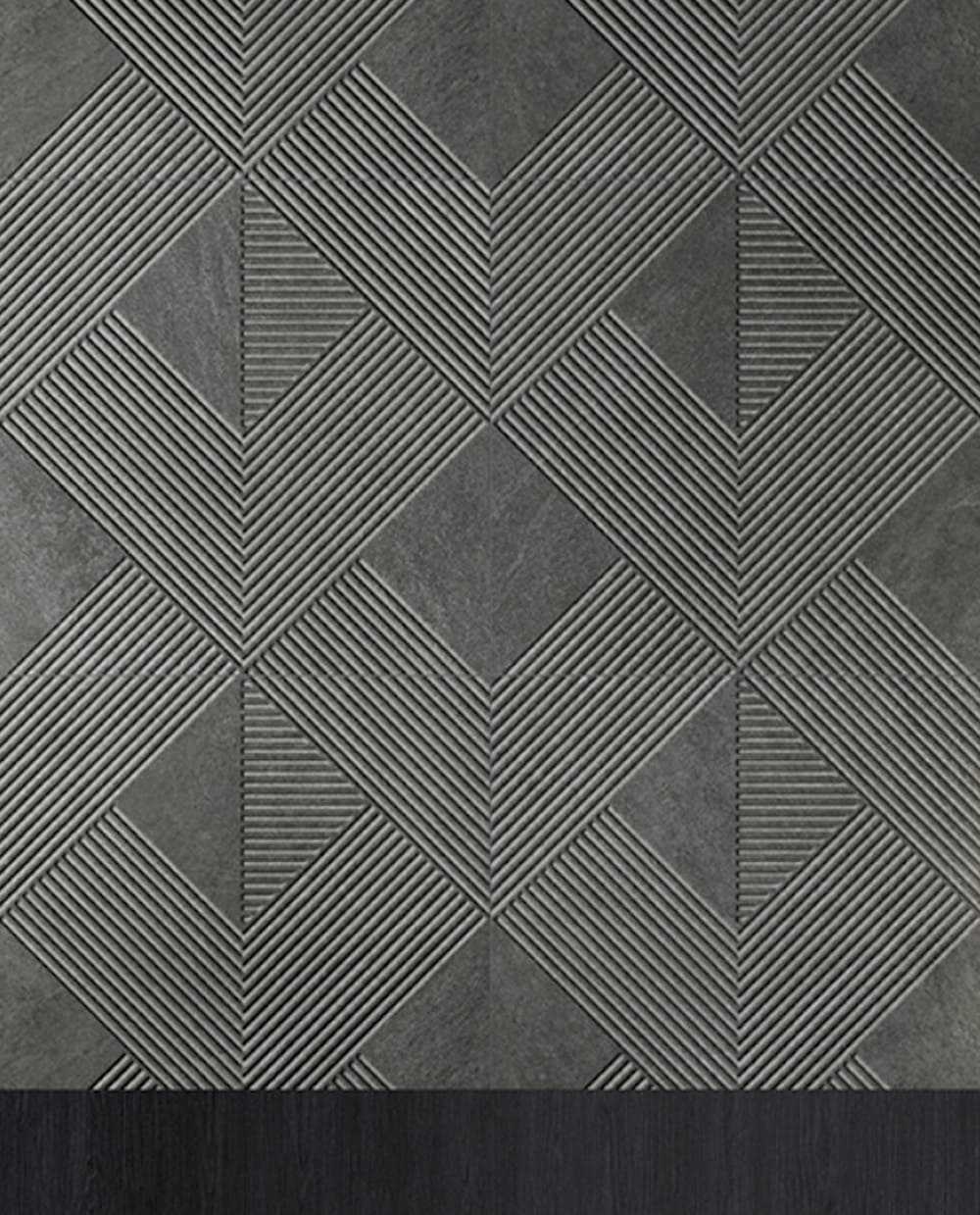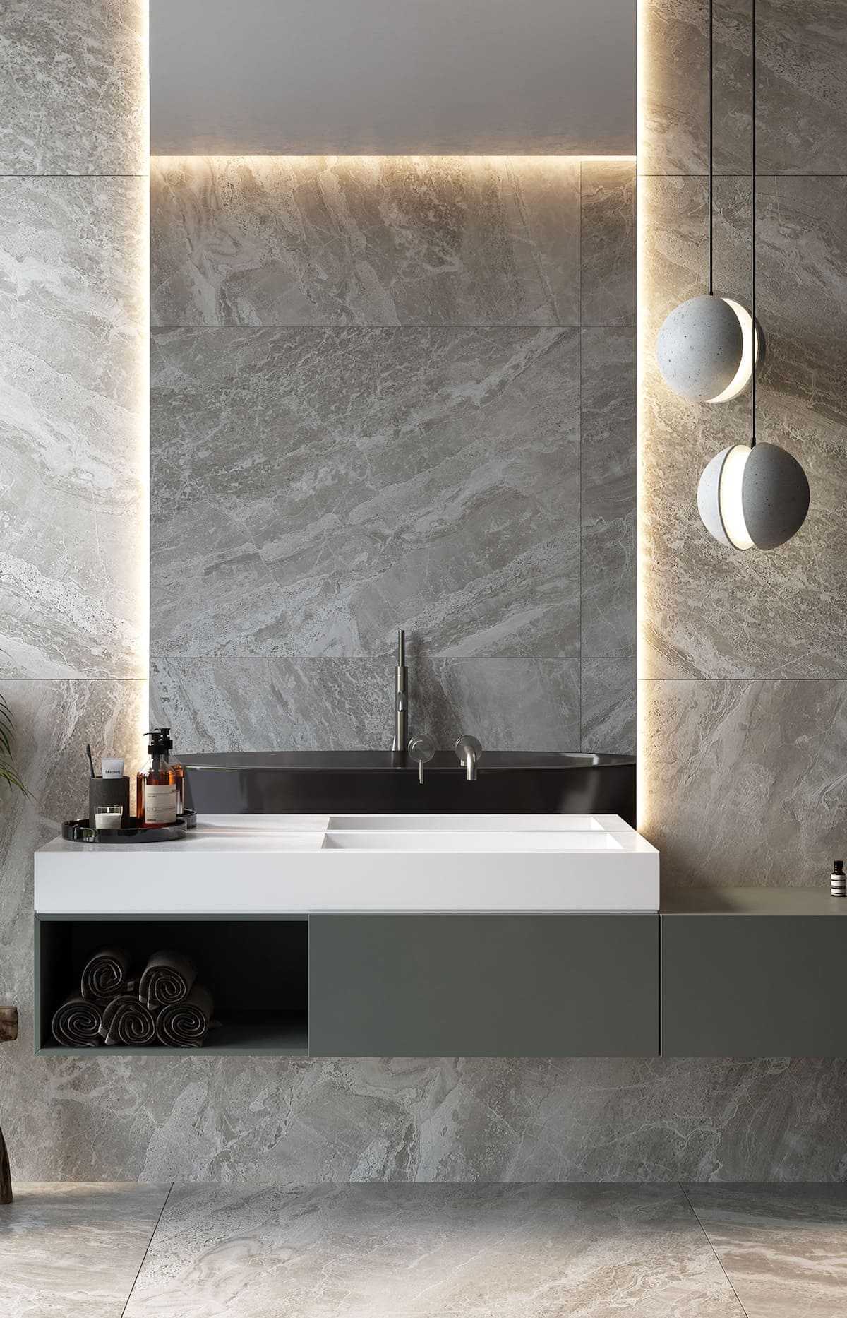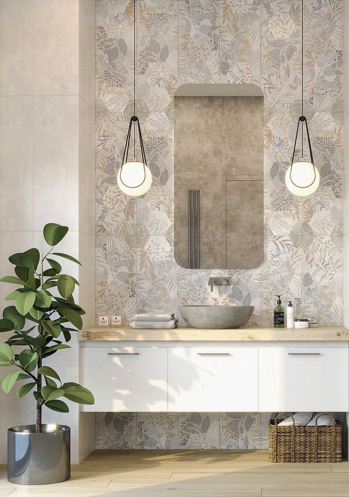 Интерьеру с современным минималистичным характером идеально подходит плитка, которая имитирует необработанный бетон. Он не исключает искусно интегрированного декора стен – не нарушит гармонию, но сделает интерьер уютным.