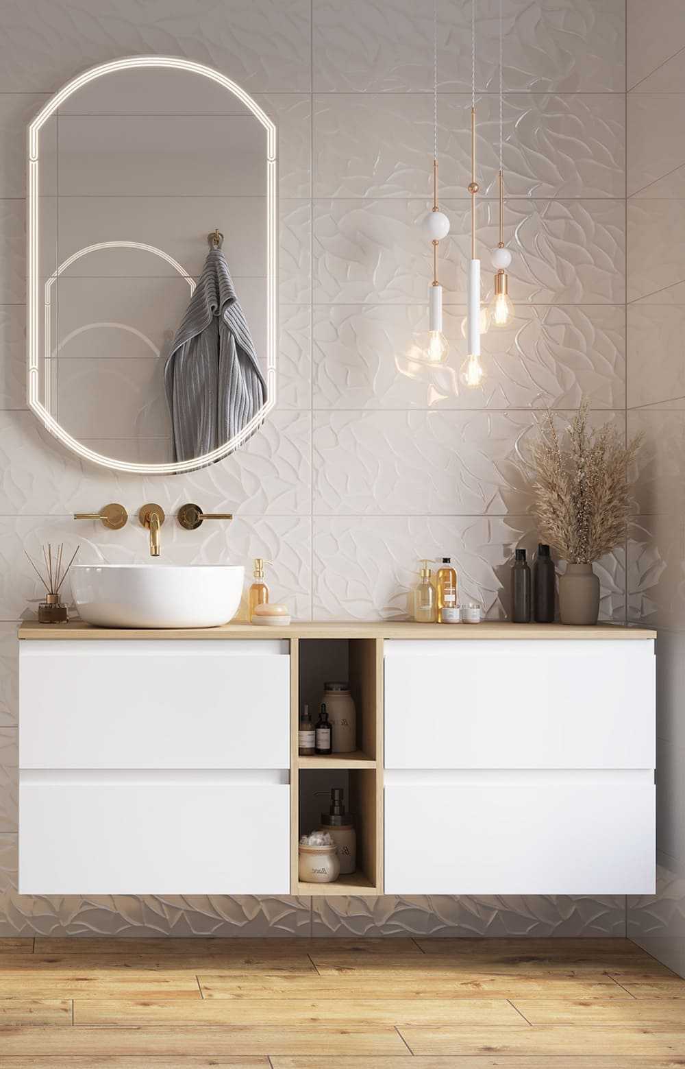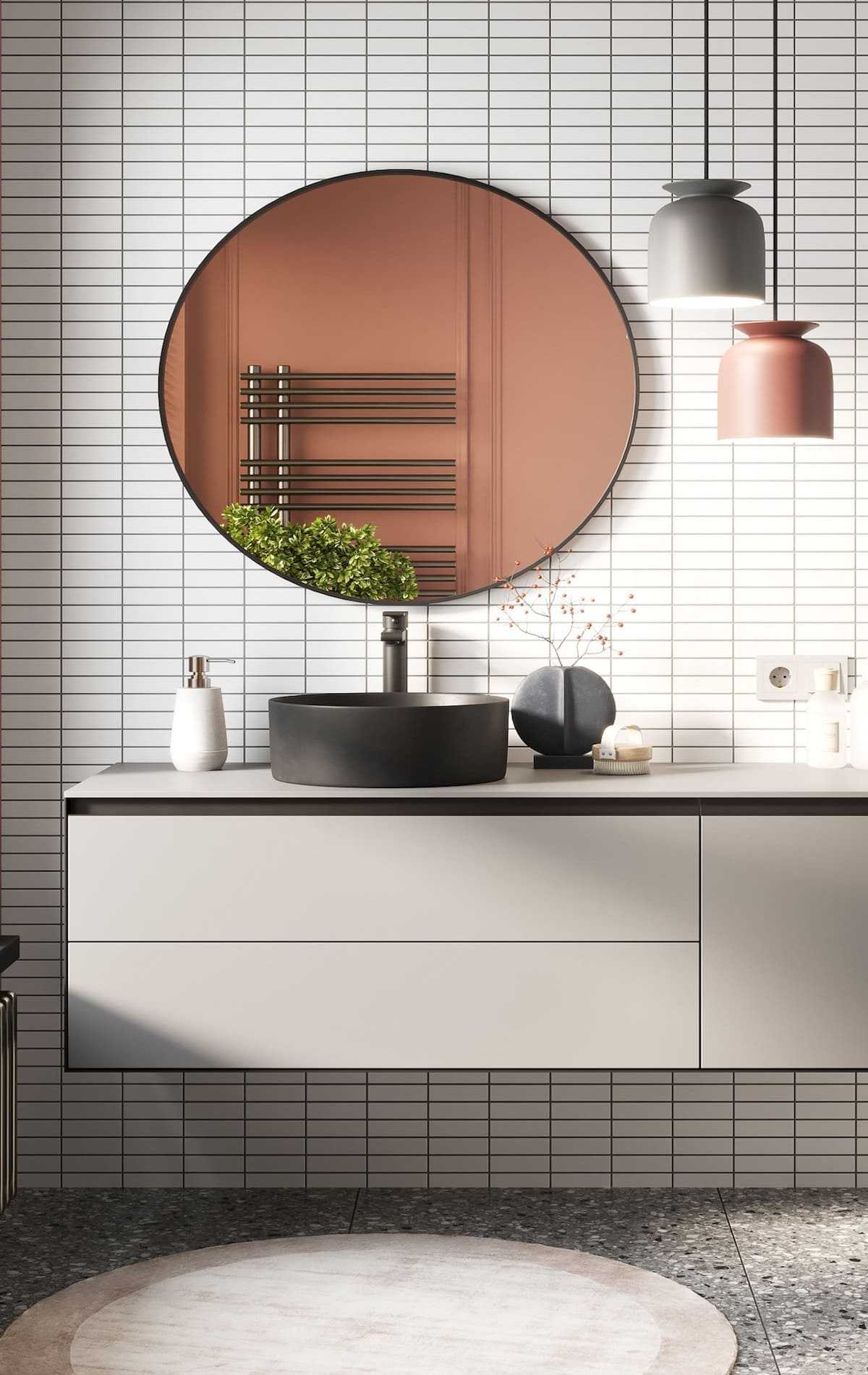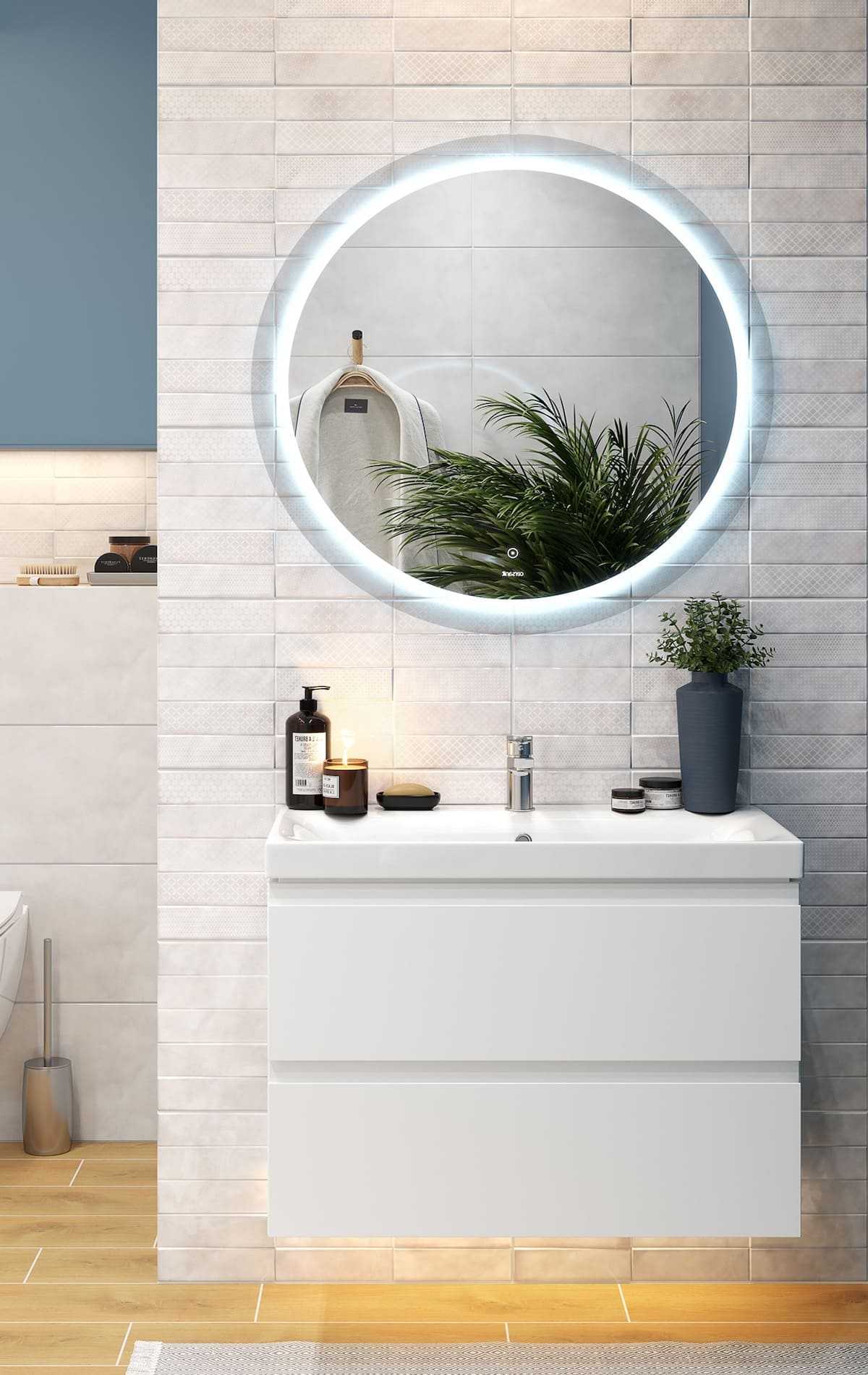 - Отдельно стоит сказать о зеркалах. В 2021-2022 году в интерьере ванной просто обязаны быть большие круглые зеркала с подсветкой – они придадут помещению более уютный, светлый и просторный вид.