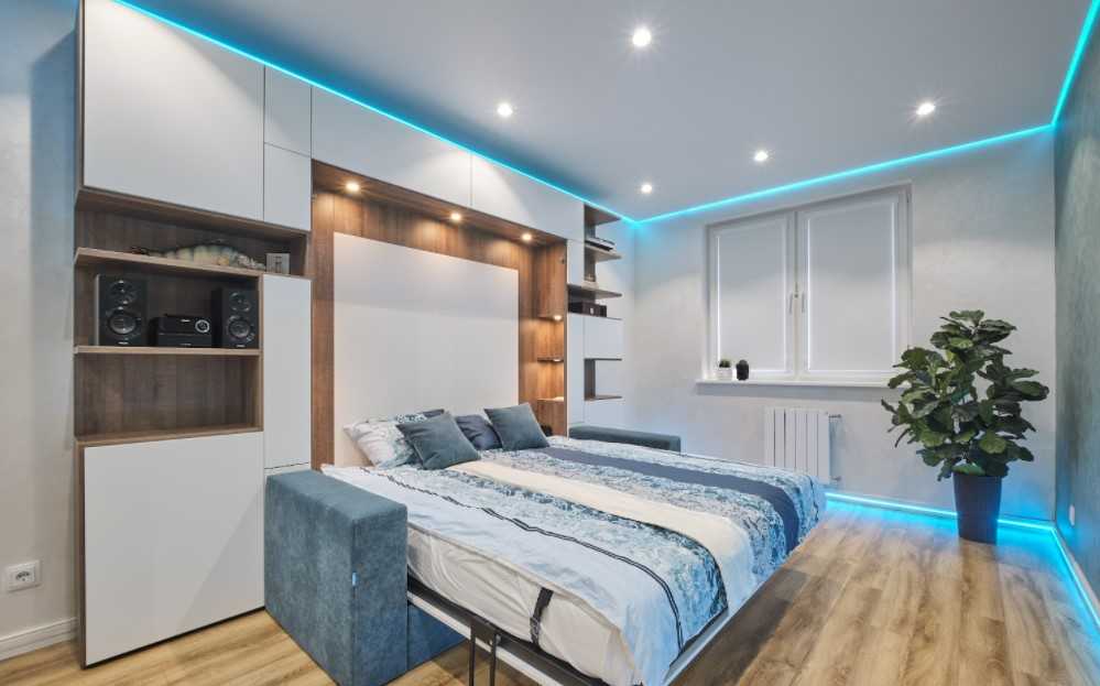 Предложение подобного характера придётся по душе жильцам, которые стремятся окружить себя инновационными решениями и не отставать от современных технологий. Что это означает? Здесь всё просто. Стиль хай-тек основывается на наличии техники в стильном современном дизайне, трансформируемой мебели, многоуровневом освещении и футуристических осветительных приборов. А также в использовании таких материалов как пластик, металл или стекло, что может выражаться в стеклянных перегородках или отражающих свет поверхностях.