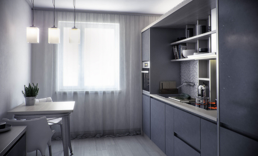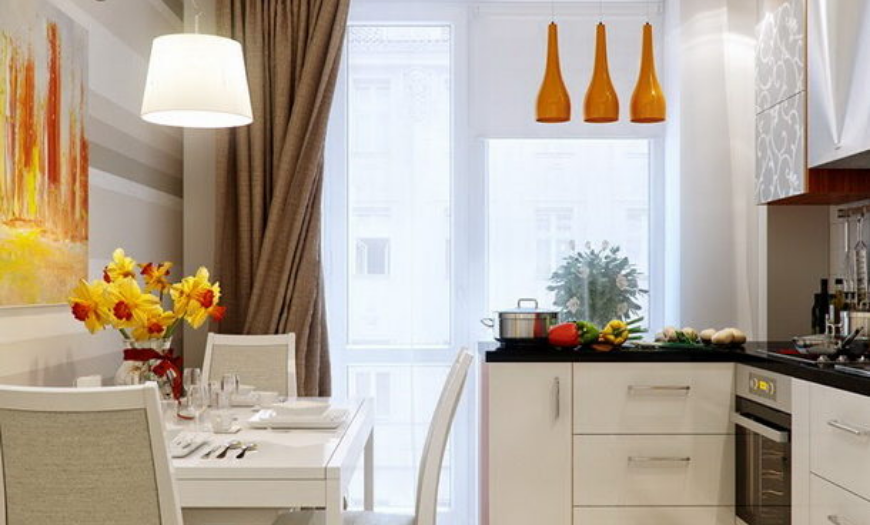 В помещение такой планировки хорошо впишется откидной стол или стол-подоконник, который позволит увеличить пространство кухни. Можно из части оконного проема сделать барную стойку и использовать ее как рабочую поверхность или обеденный стол.