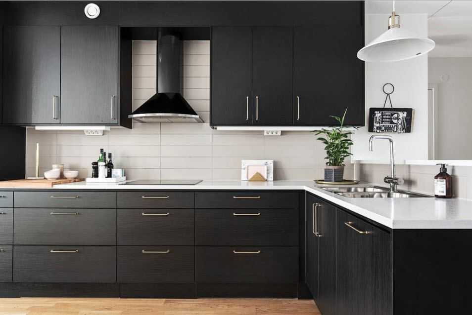 И крайне важно будет этот темный фон разбавить белым или бежевым фартуком. Плюс стены также придется окрасить или оклеить в светлых тонах, играющих на контрасте с основным темным цветом