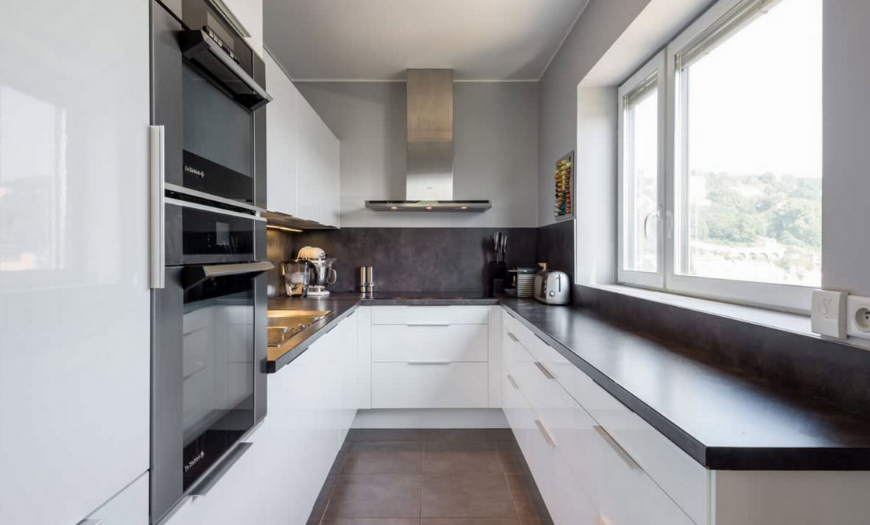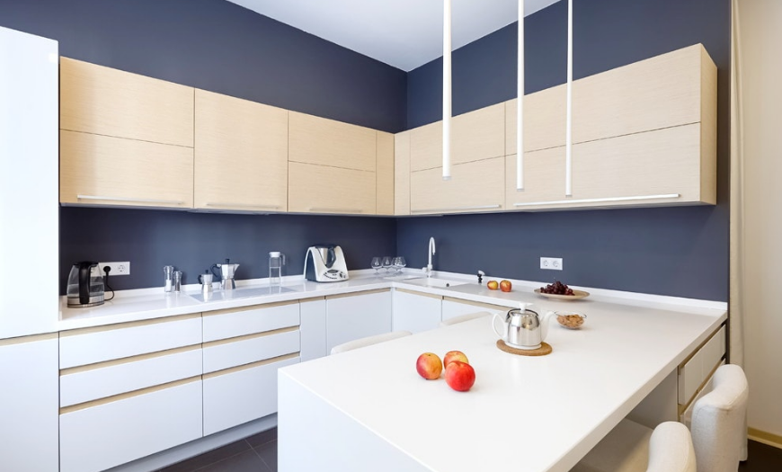 Такая планировка, когда кухонный гарнитур размещен вдоль трех стен, для кухни площадью 9 кв. м не подойдет. Свободного пространства на обеденную зону не останется.