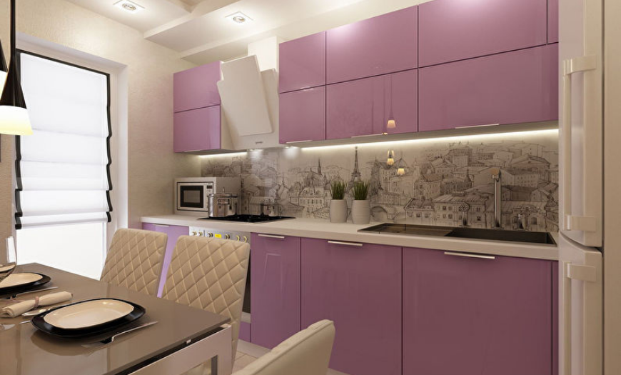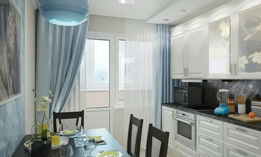 Кухни с выходом на балкон часто встречается в девятиэтажках и наиболее проблематичны в плане дизайна, т.к. одна стена полностью занята окном и дверью.