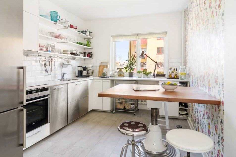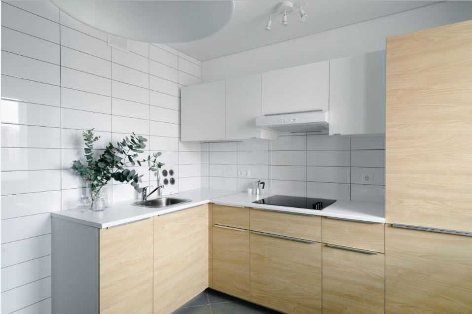 Скандинавский. Модный стиль, характеризующийся светлыми тонами и подходящий для кухни 9 кв. м. Его основные особенности: белые или бежевые фасады, природные материалы, открытые полки, минимум декора, обилие зелени.