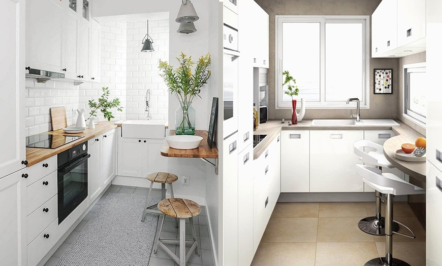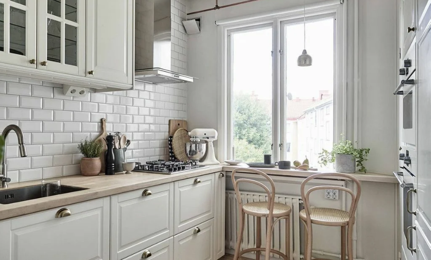 При выборе материалов, мебели и стилистики нужно учитывать размер кухни, сделать так, чтобы визуально увеличить пространство. Единственной такой возможностью является выбор светлых, нейтральных оттенков без крупных геометрических узоров.