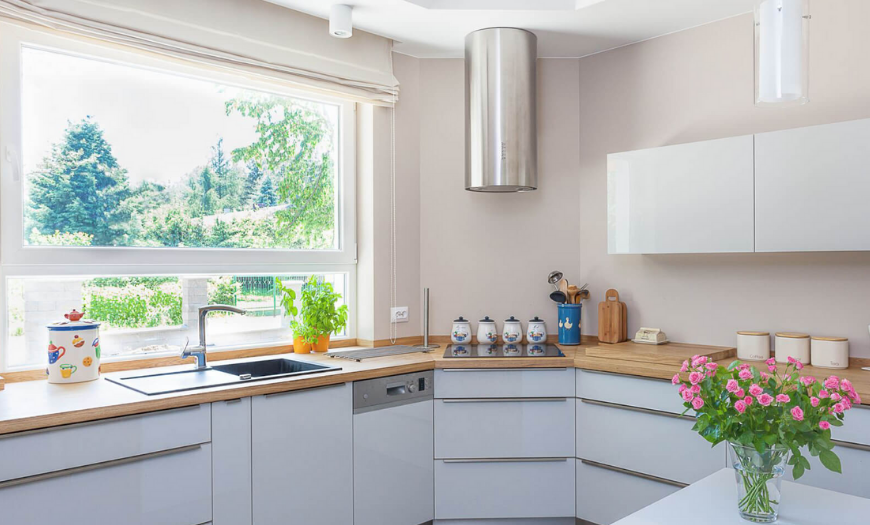 Окно удобно задействовать при угловой планировке. Один из вариантов — это размещение рядом с ним мойки или установка рабочей поверхности, объединенной с подоконником.