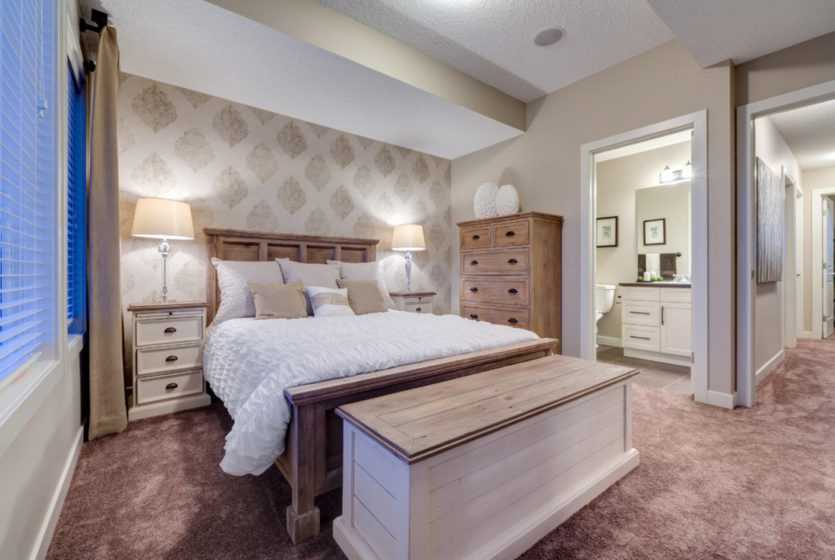 И если площадь спальни позволяет поэкспериментировать, то самым трендовым будет решение, когда общий интерьер создается в двух оттенках. При этом шкаф и кровать, а также дополнительные акценты делаются в одном цвете.