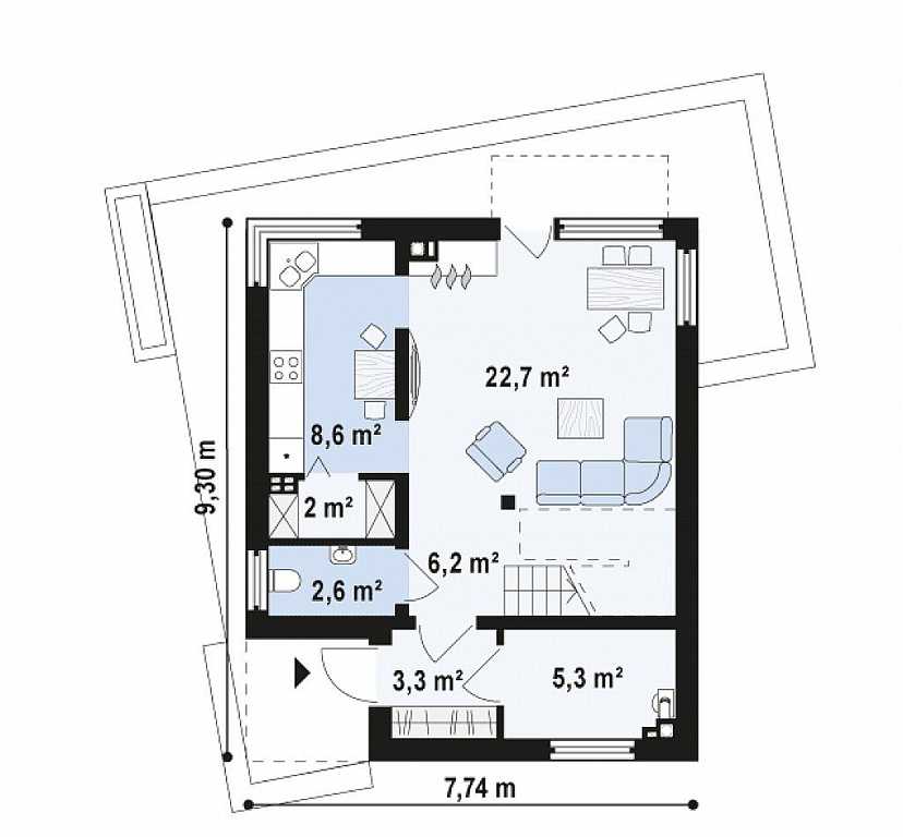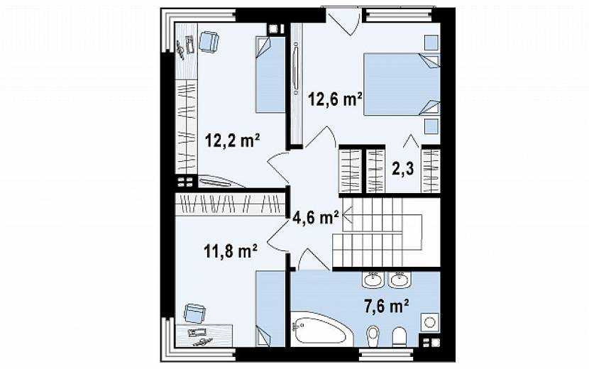 Небольшой наклон крыши обеспечивает сток дождевой и талой воды и не мешает безопасно передвигаться по крыше. Расчетная площадь 86 м² увеличивается за счет эксплуатируемой крыши. Монолитное перекрытие и ПВХ мембрана крыши гарантируют длительный срок эксплуатации дома. Плоская крыша подчеркивает объемы помещения, придает всему строению современный вид.
