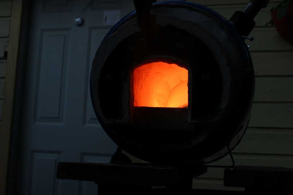 Наденьте защитные очки и поставьте рядом огнетушитель. Чтобы разжечь пламя, используйте специальную длинную зажигалку для гриля и поднесите огонек прямо к отверстию с трубкой горелки. Медленно открывайте вентиль подачи газа, в горне должно появиться пламя. Пока оставьте маленькое пламя.