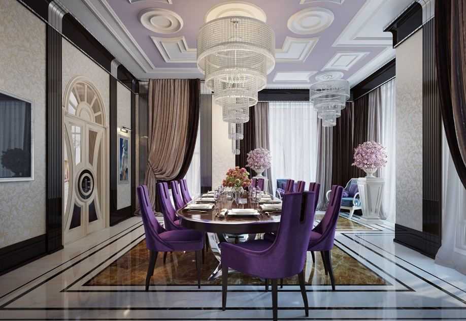 Очень хороший эффект даёт сочетание старинной и современной мебели, современных осветительных приборов и антикварных предметов декора. Очень интересный результат получается, если оформить потолок ультрамодными точечными светильниками, которые зонируют пространство и традиционной хрустальной люстрой.