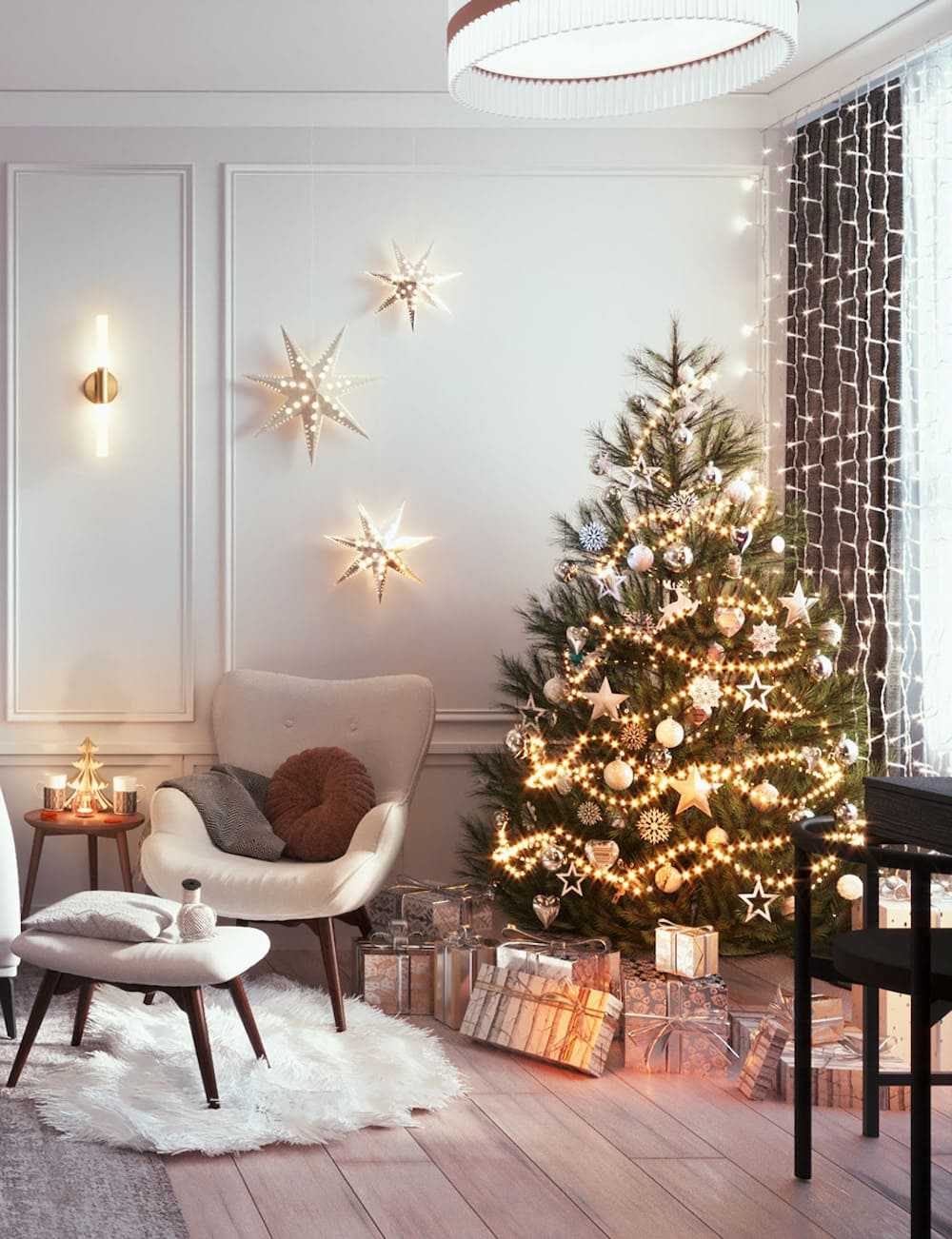 При подготовке дома к новогоднему празднику следует учесть, что есть помещения, где требуется минимальное количество украшений — прихожая и спальня. Они должны выполнять свои назначения, а обилие мишуры, гирлянд будет только мешать.