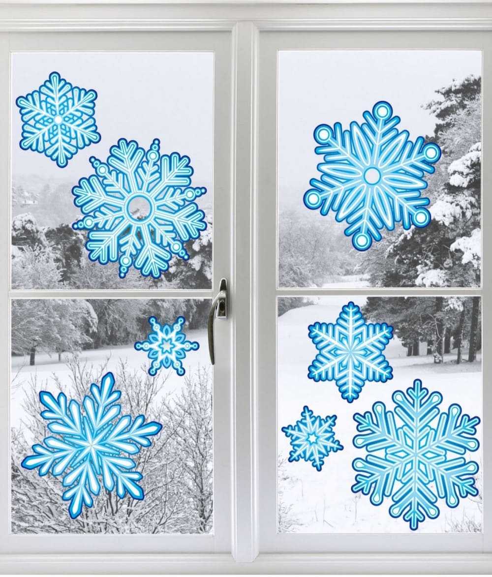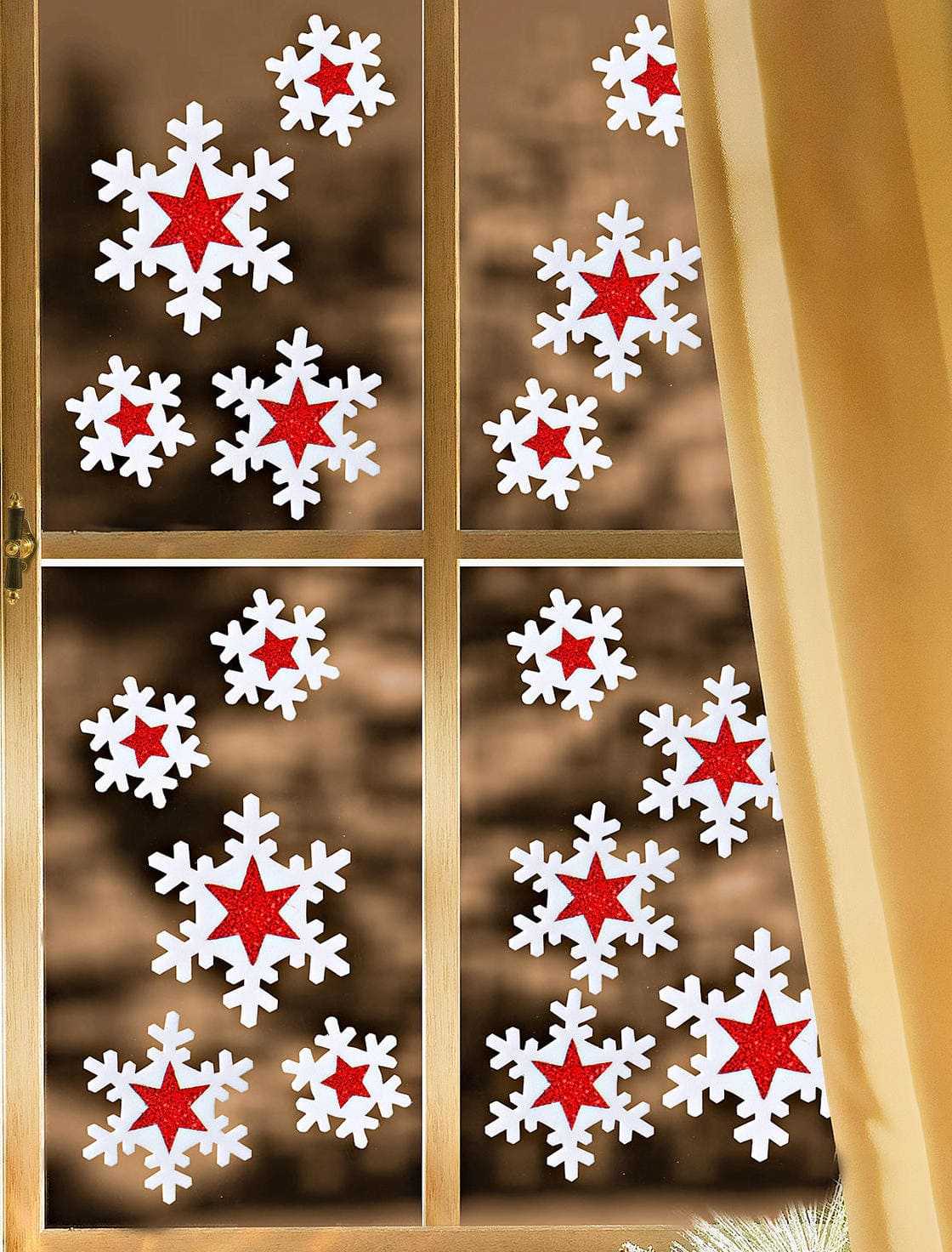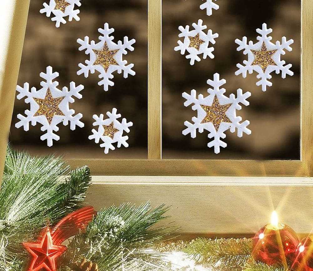 Замечательными площадками для создания новогодних экспозиций являются окна. На стеклах крепят снежинки, светящиеся наклейки, рисуют «морозные» узоры. На подоконниках можно сделать ватные сугробы и деревья из белого картона, подсвеченные огоньками гирлянд. Другим вариантом украшения подоконника будут свечи в красивых подсвечниках и еловые букеты.