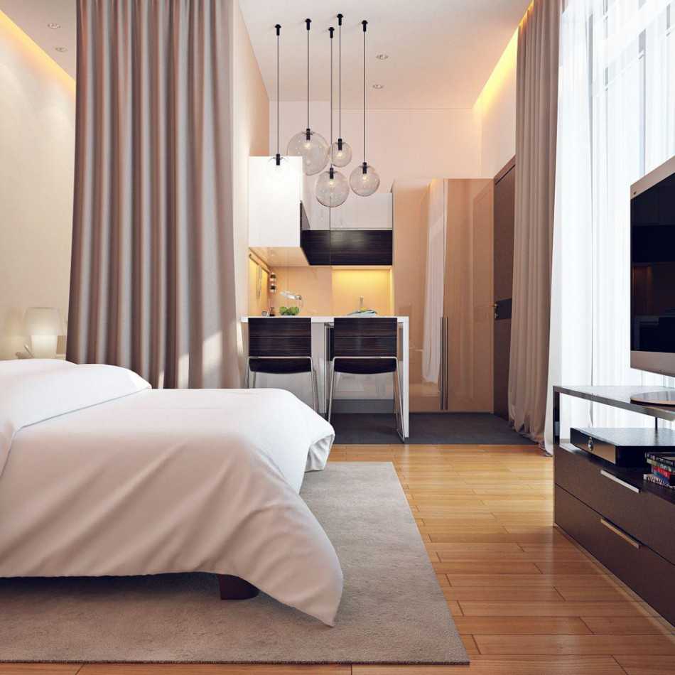 Небольшую однокомнатную студию 29 кв. м. разделили на две зоны, в одной из которых – дальней от окна – разместилась спальня, а в другой – гостиная. Друг от друга они отделены декоративными тканевыми занавесями. Кроме того, удалось найти место не только для кухни и санузла, но и для гардеробной.