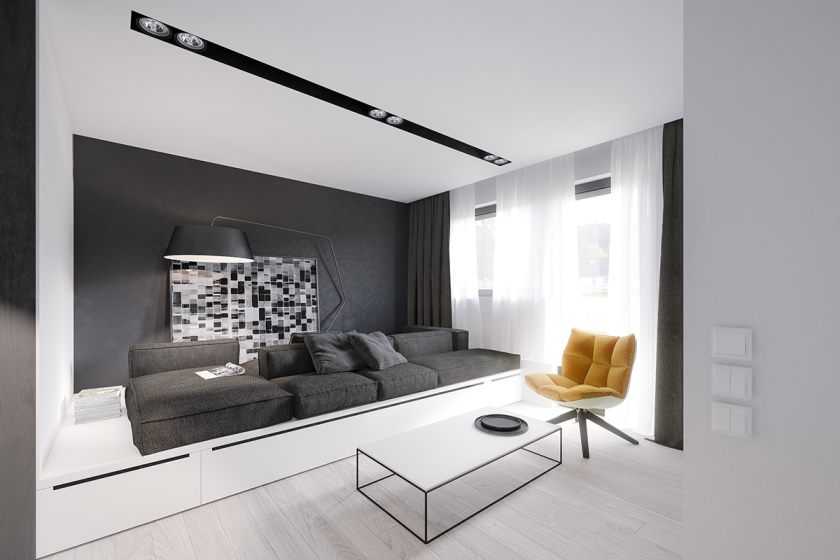 От спальни гостиная отделяется плотной шторой серого цвета. Использование природной палитры и натуральных материалов придает интерьеру солидность. Основные цвета дизайна – серый, белый, коричневый. Контрастные детали выполнены в черном цвете.