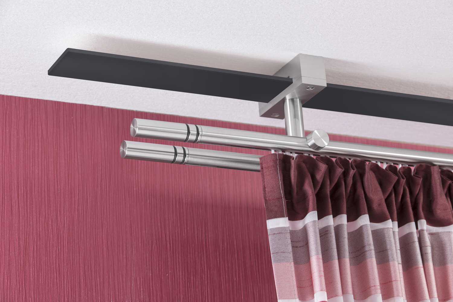Такие карнизы применяются в паре с классической комбинацией оформления оконного проема: тюль + шторы. На первой, ближней к стене направляющей, фиксируется легкая тюль, на второй — основные полотнища занавеса.