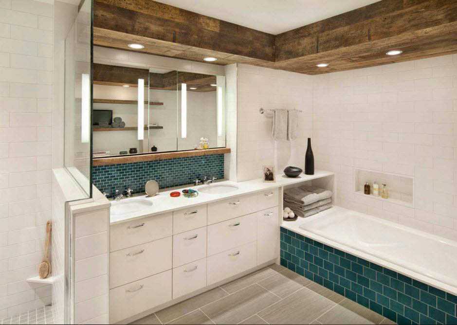 Так или иначе, но приведенные фото демонстрируют, что ванные комнаты в загородных коттеджах — хороший плацдарм для претворения в жизнь самых интересных оформительских идей. Однако балки на потолок из дерева можно и даже нужно в них использовать, только если в помещении созданы условия для полноценной вентиляции.