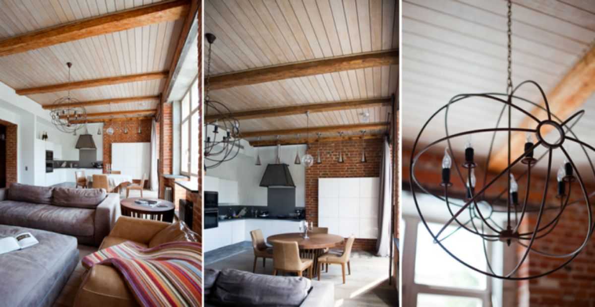 Функциональность помещения можно подчеркнуть при помощи дизайнерских светильников, которые будут свисать с металлических конструкций.