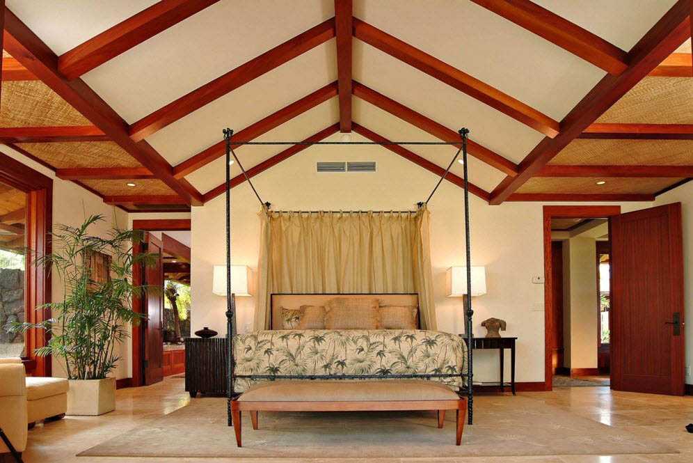 Интерьер коттеджа или дачного дома с высоким покатым потолком украсит объемное сооружение из деревянных балок, повторяющая кровельную конструкцию.